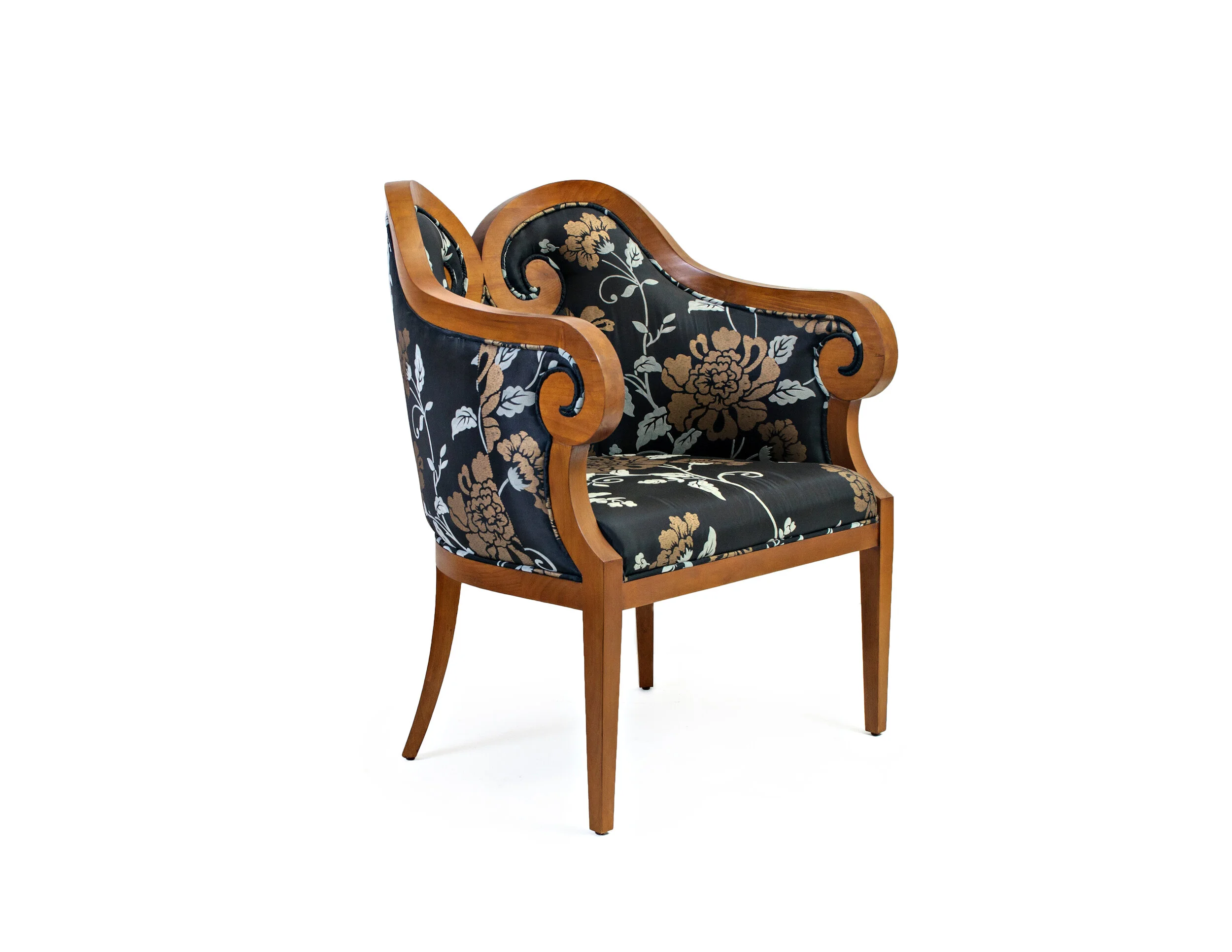 Dimensions 700 x 670 x 920 mm ht. 27 1/2" x 26 1/2" x 36 1/4" ht.Finish Fully Upholstered in Wood in Medium Brown Finish