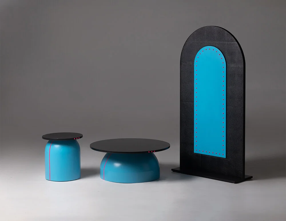 Finish Black Wooden Top & Base in Azure Blue & Groove/Studs in Neon Pink